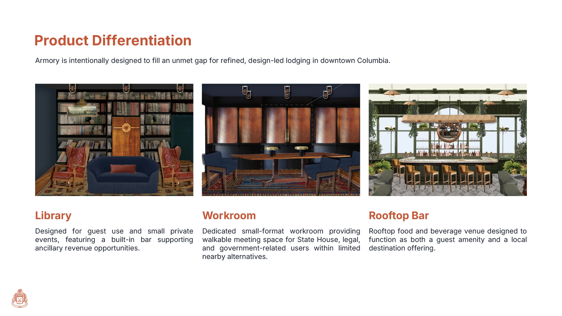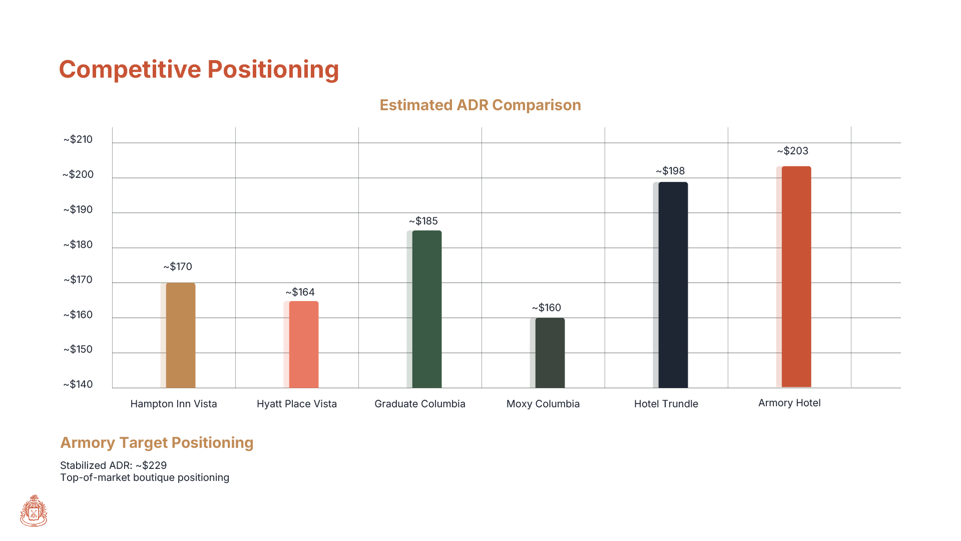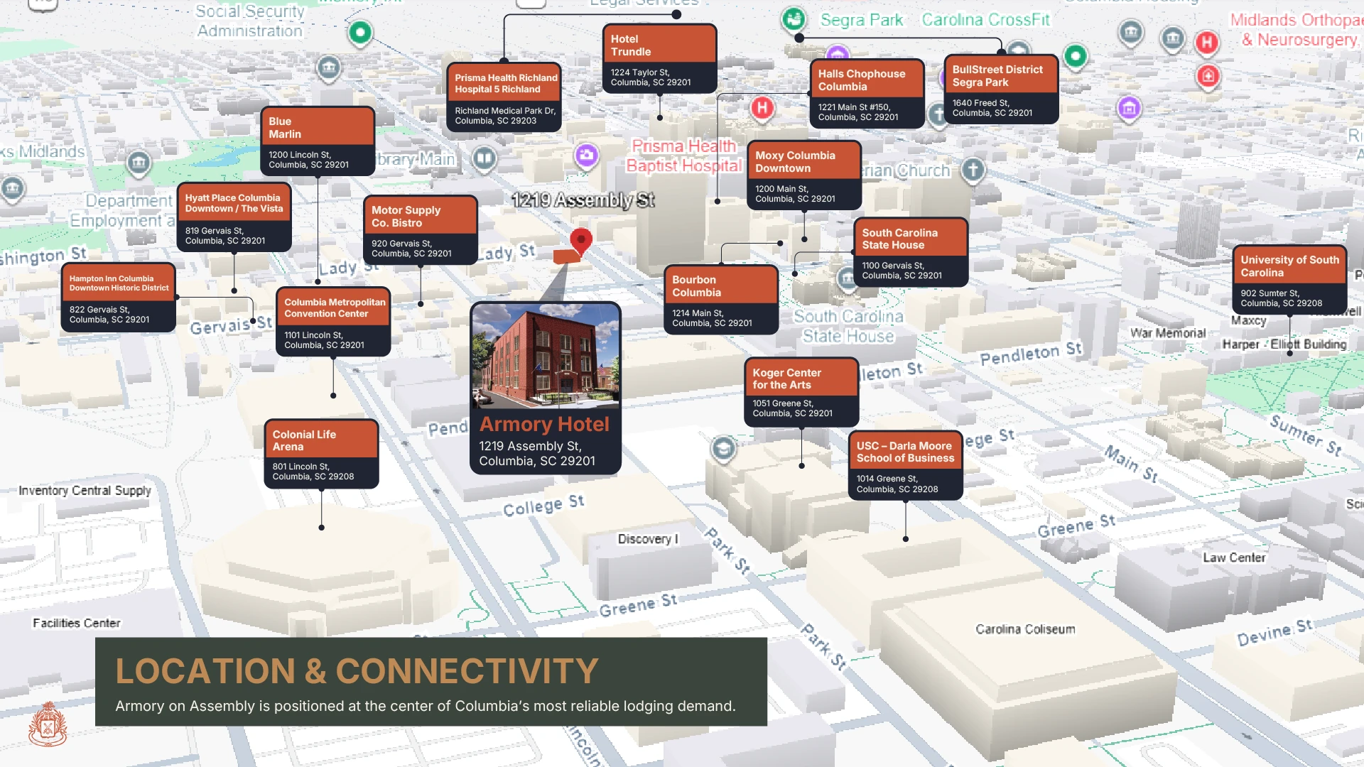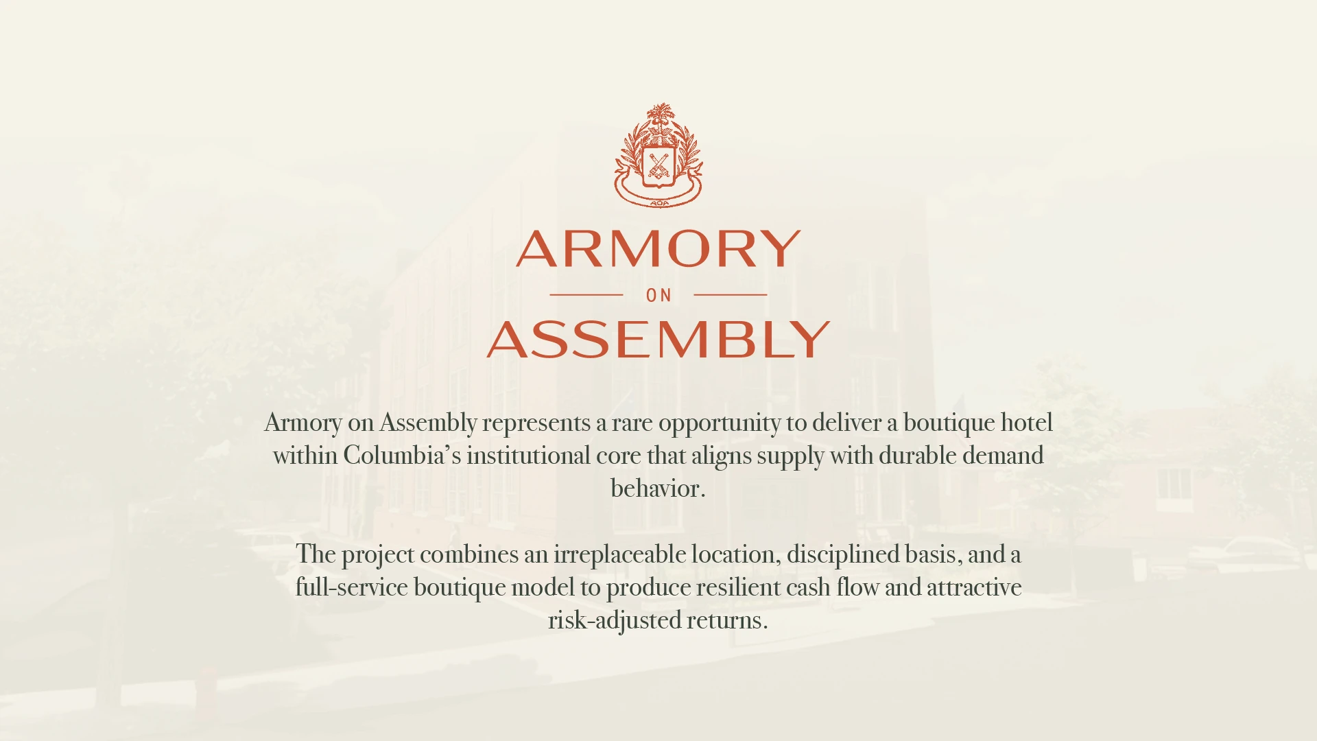 A pitch deck transforming a 1905 armory into a 44-key boutique hotel, establishing Armory on Assembly as Columbia’s premier destination.