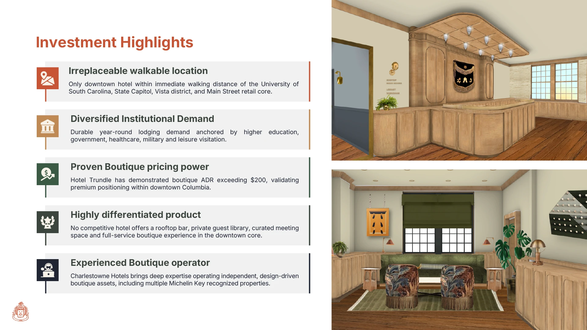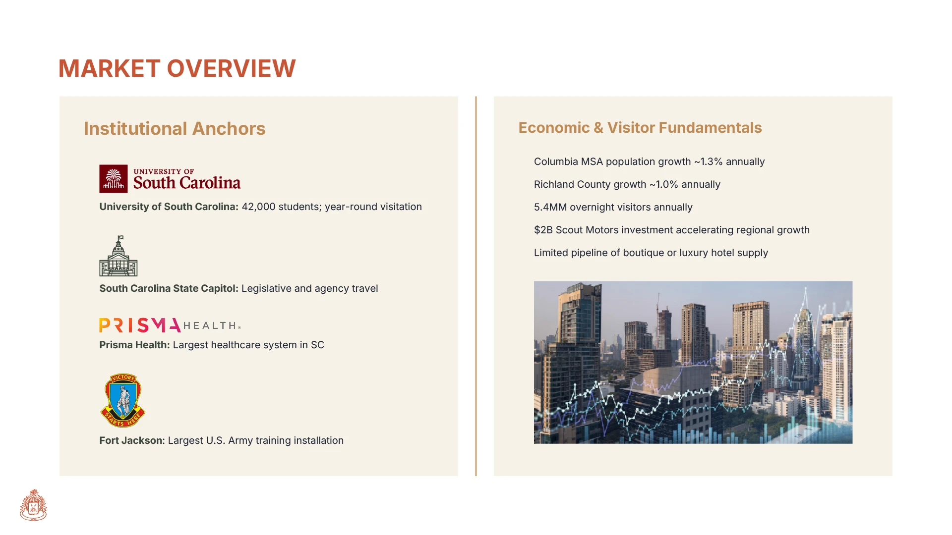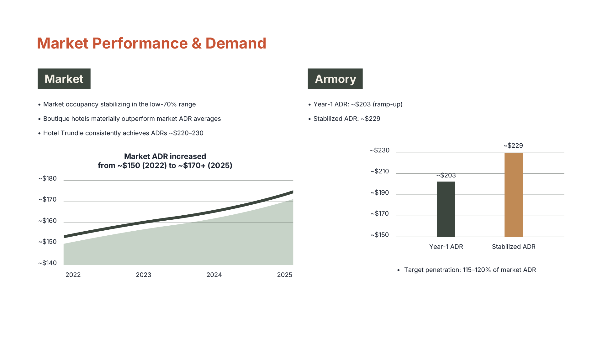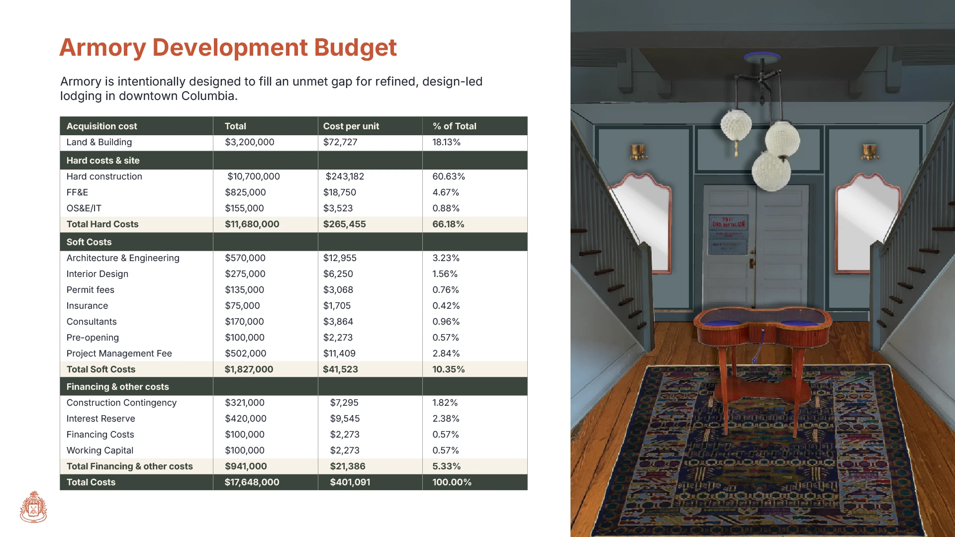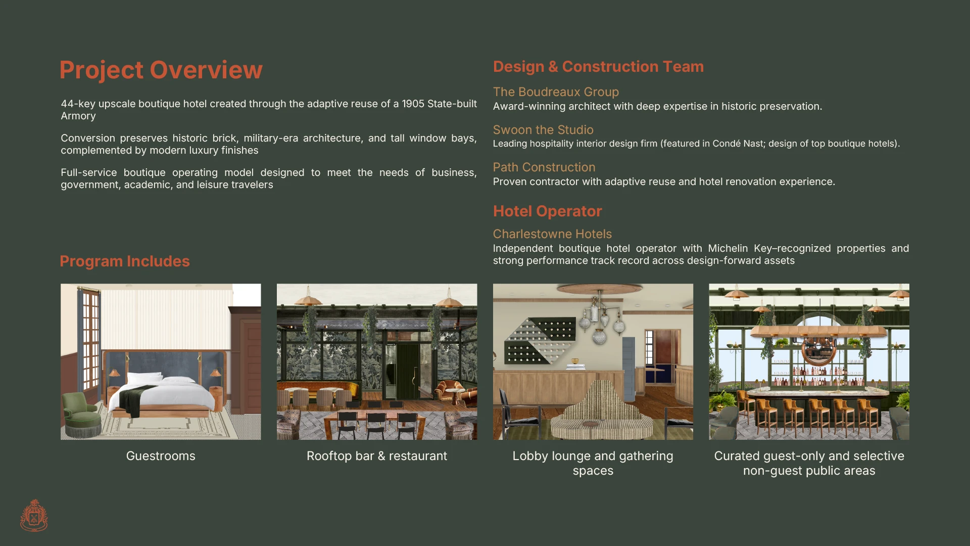 A pitch deck transforming a 1905 armory into a 44-key boutique hotel, establishing Armory on Assembly as Columbia’s premier destination.