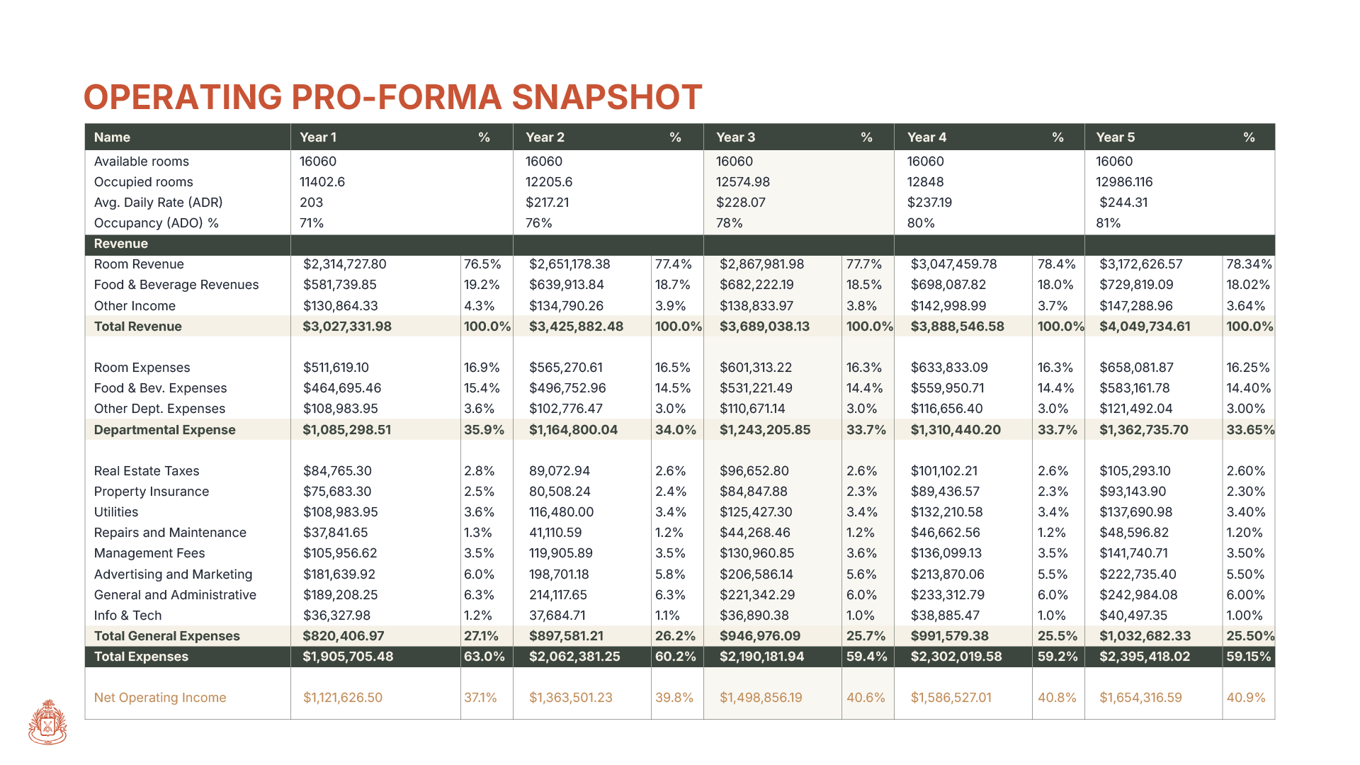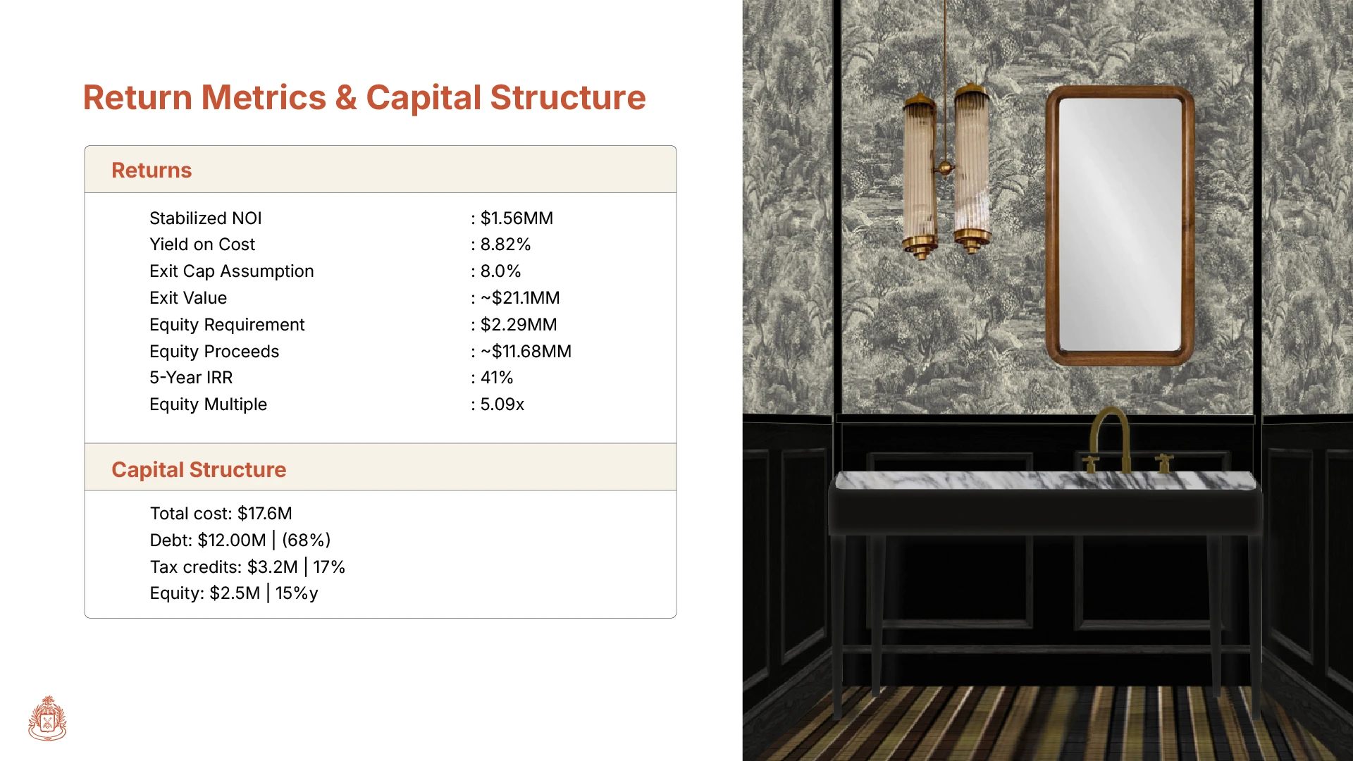 The client faced a complex challenge: raising equity for a historic adaptive-reuse hotel in a secondary market while aligning investors around risk, returns, and positioning. We transformed a dense capital stack, market data, and preservation story into a clear, investor-ready narrative resulting in a pitch deck that successfully raised $2.3M in equity and unlocked the project’s next phase.