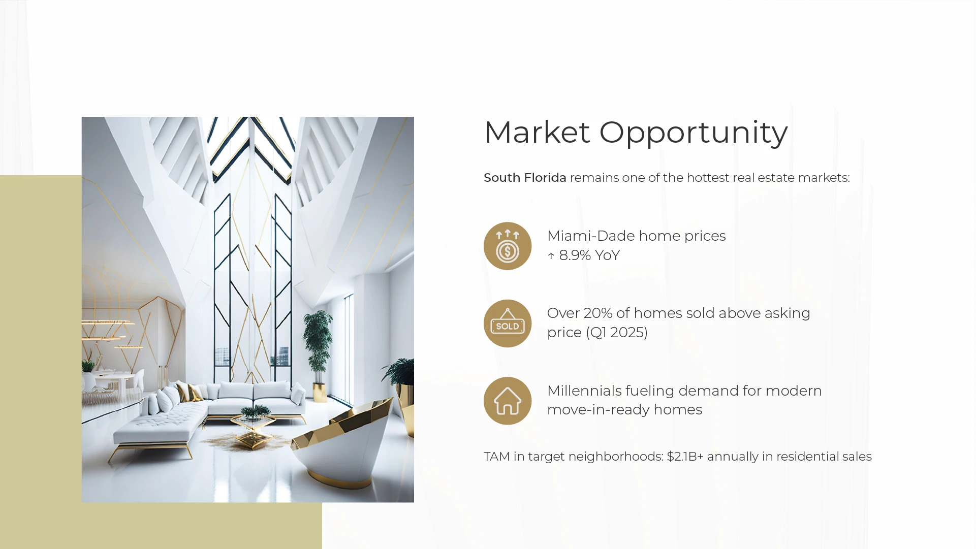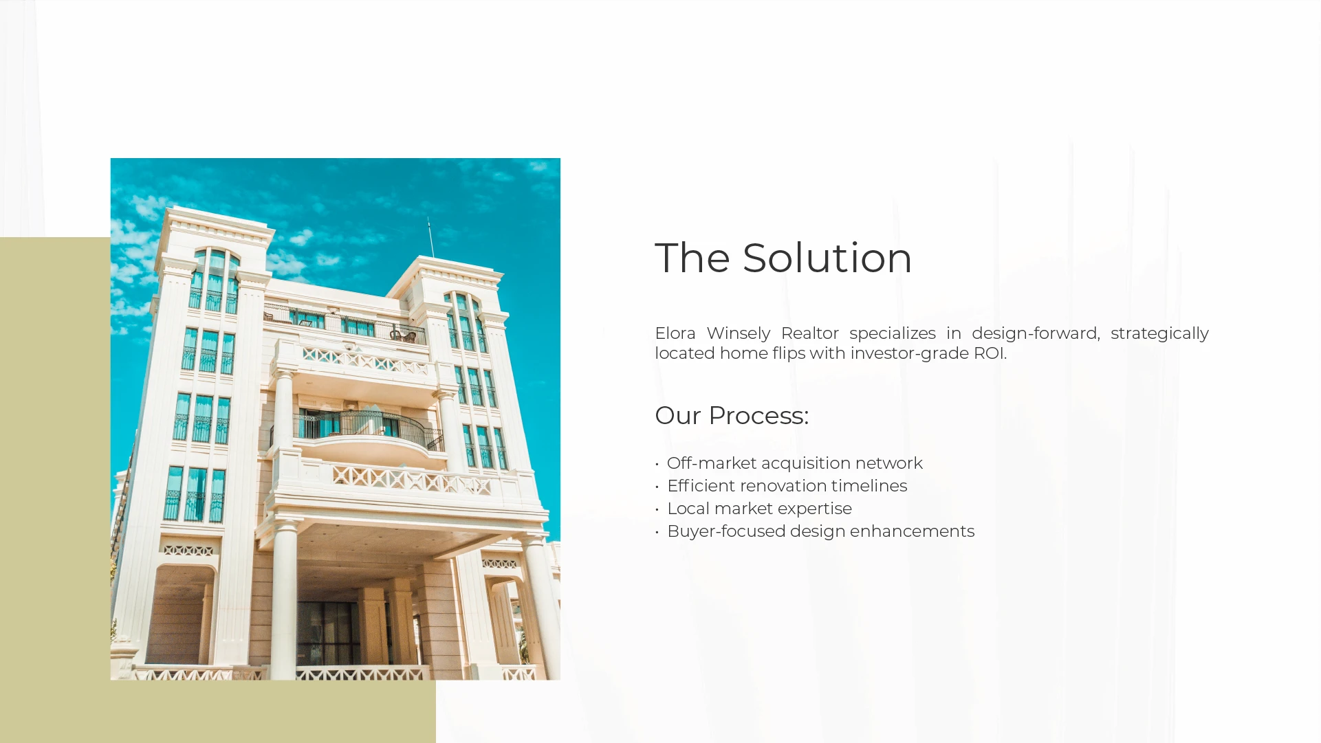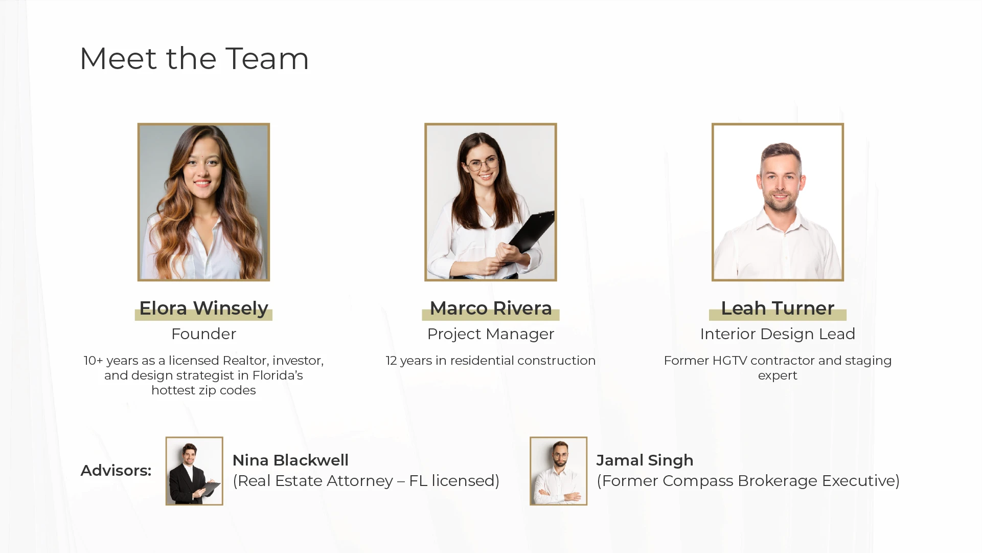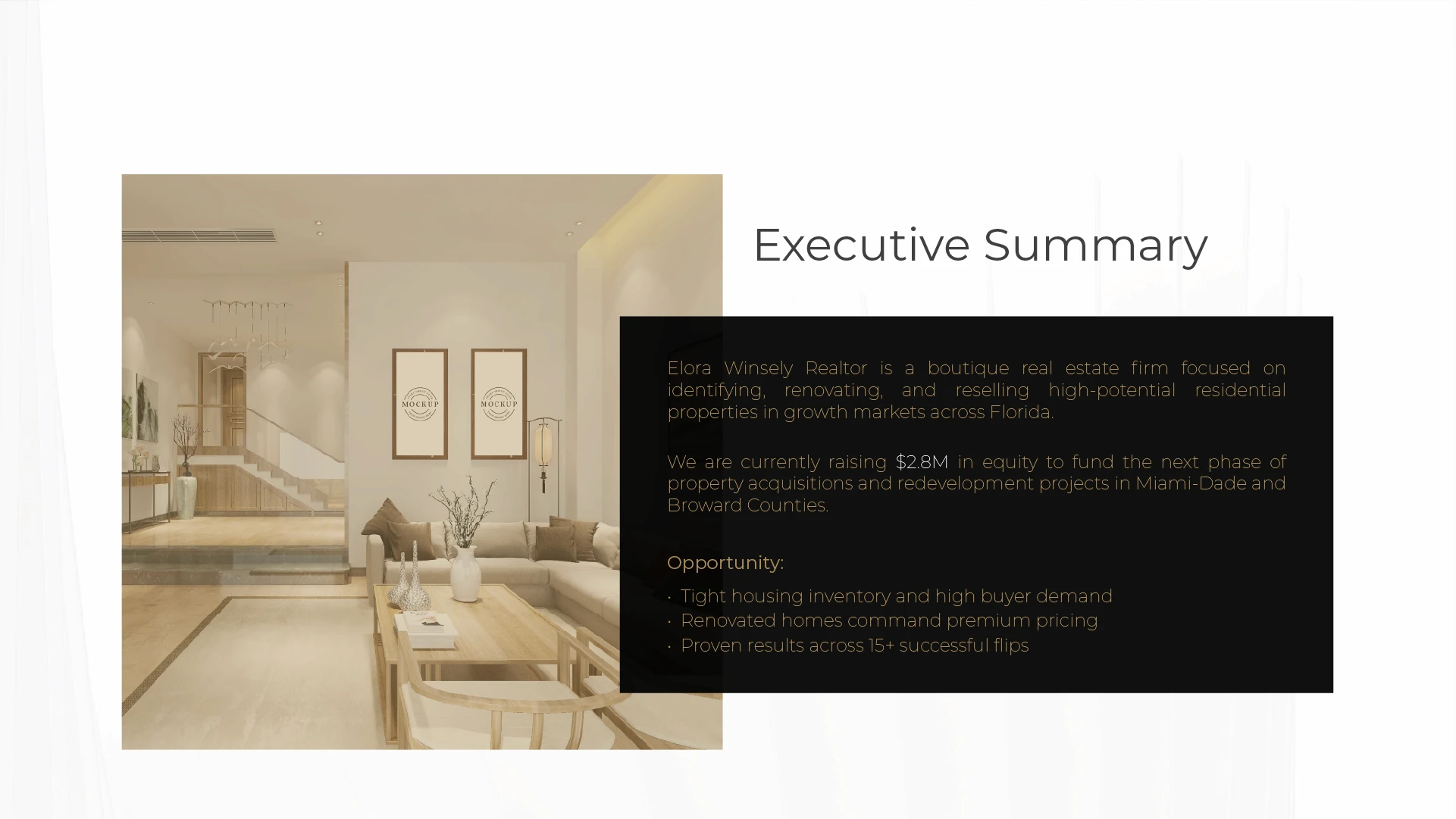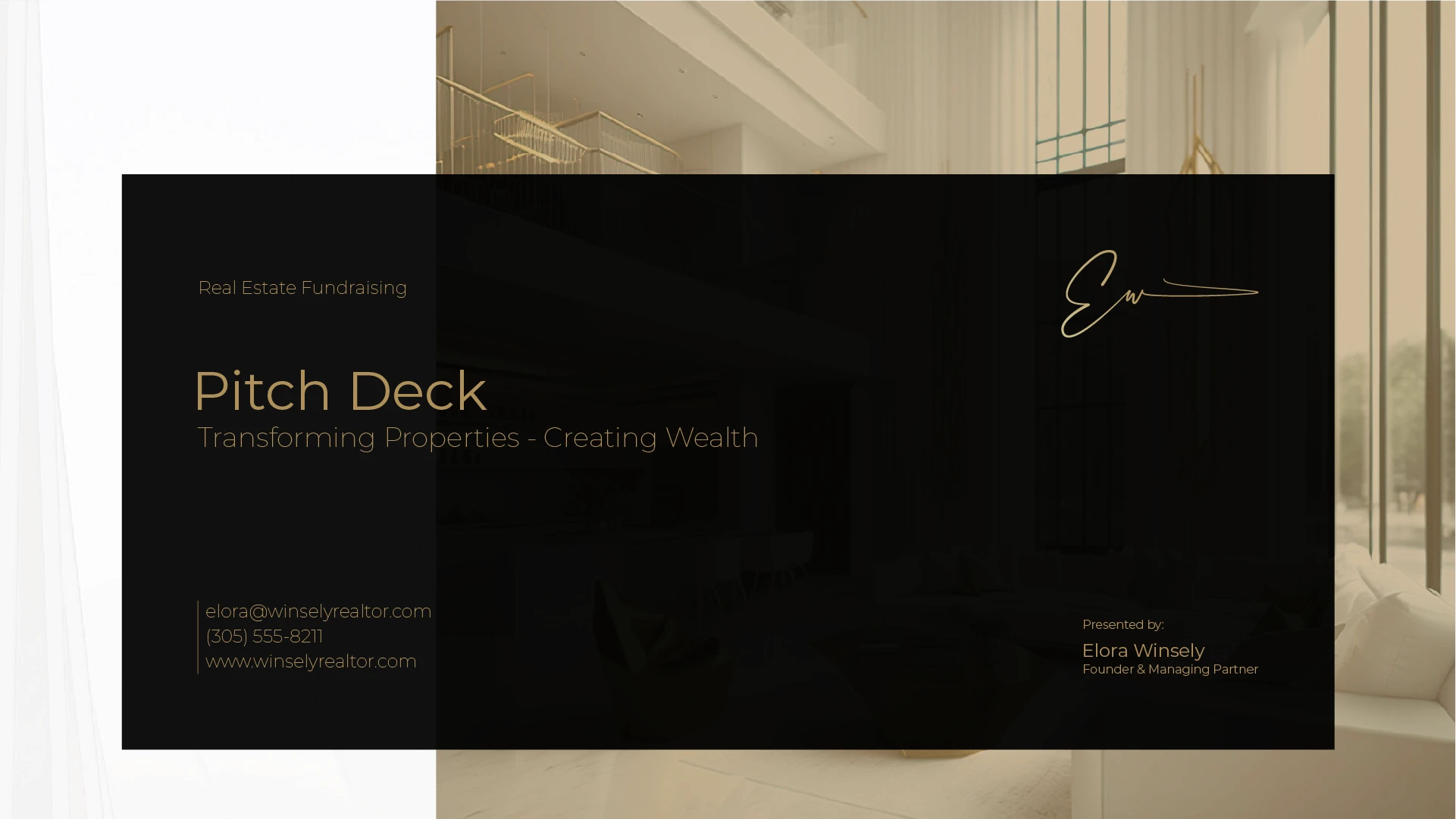 Crafted a high-impact fundraising pitch deck for Elora Winsely Realtor, a boutique real estate firm in Florida.