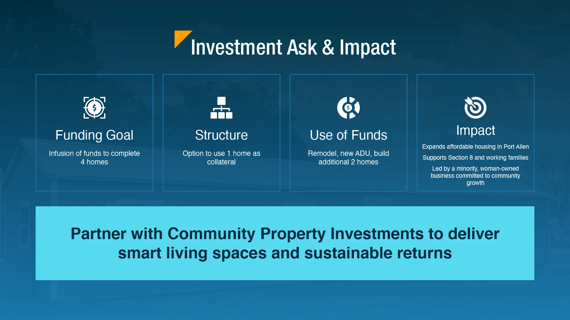 Community Property Investments needed more than a pitch deck. They needed a clear, investor focused story that translated a multi home development into a compelling financial opportunity. Their initial materials lacked structure, a cohesive narrative, and the numbers required to earn investor confidence.