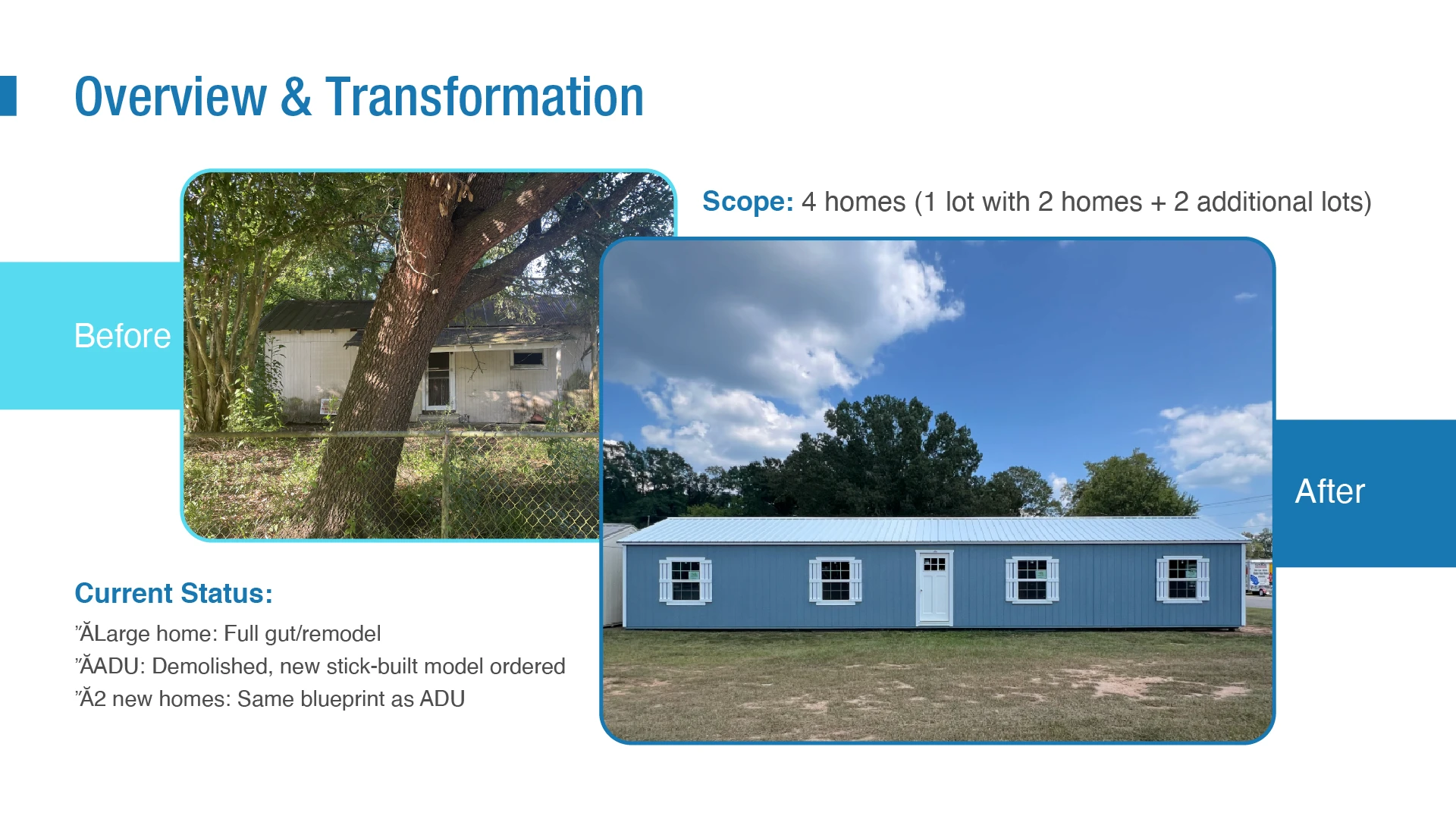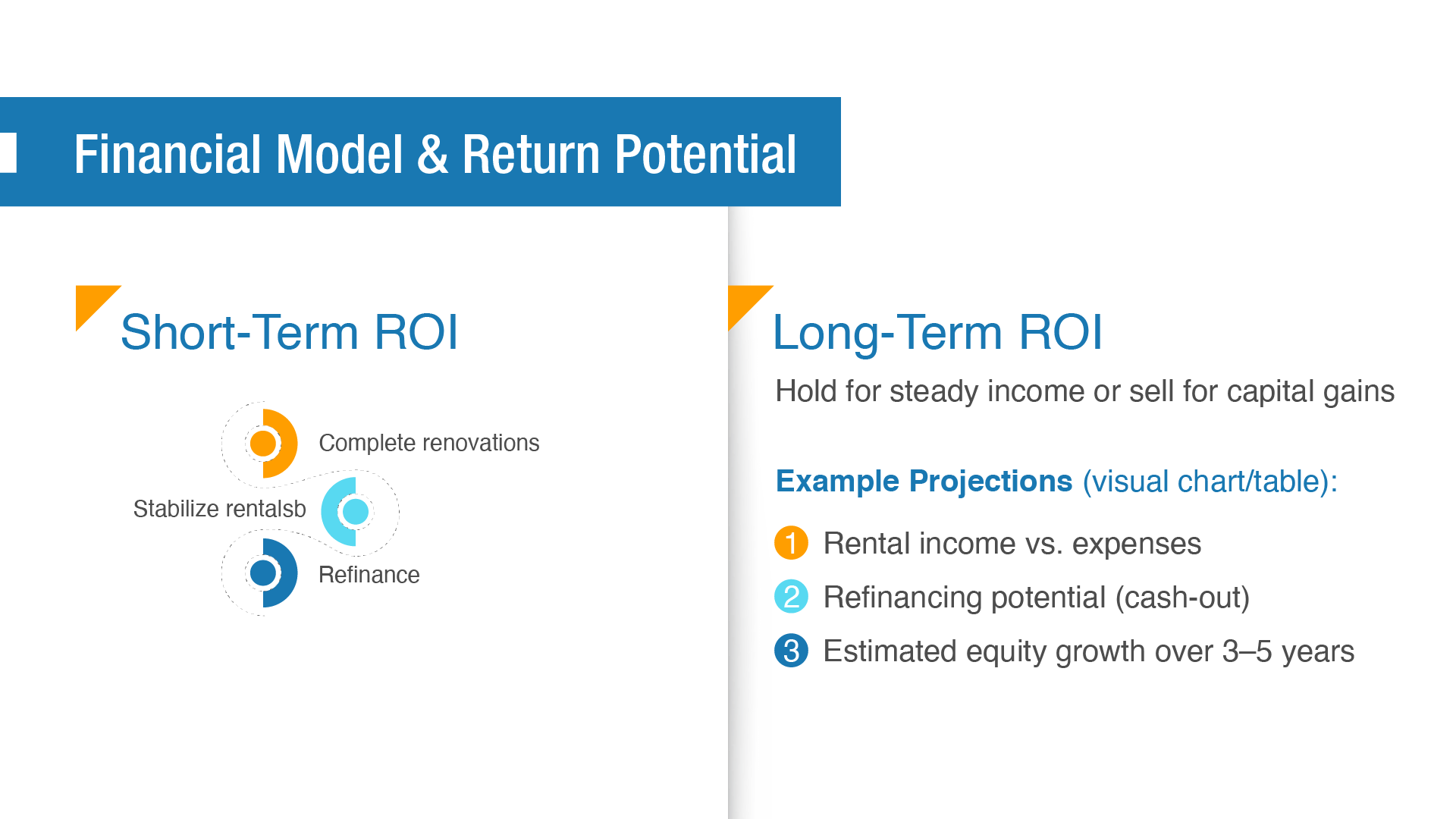 We rebuilt the entire deck from a strategic foundation. The investment thesis was clarified, the financial model was reorganized for readability, and valuation, rental income, and ROI projections were visualized with precision. We reframed the before and after transformation into a measurable value creation story and aligned the entire flow with how real estate investors evaluate opportunities.