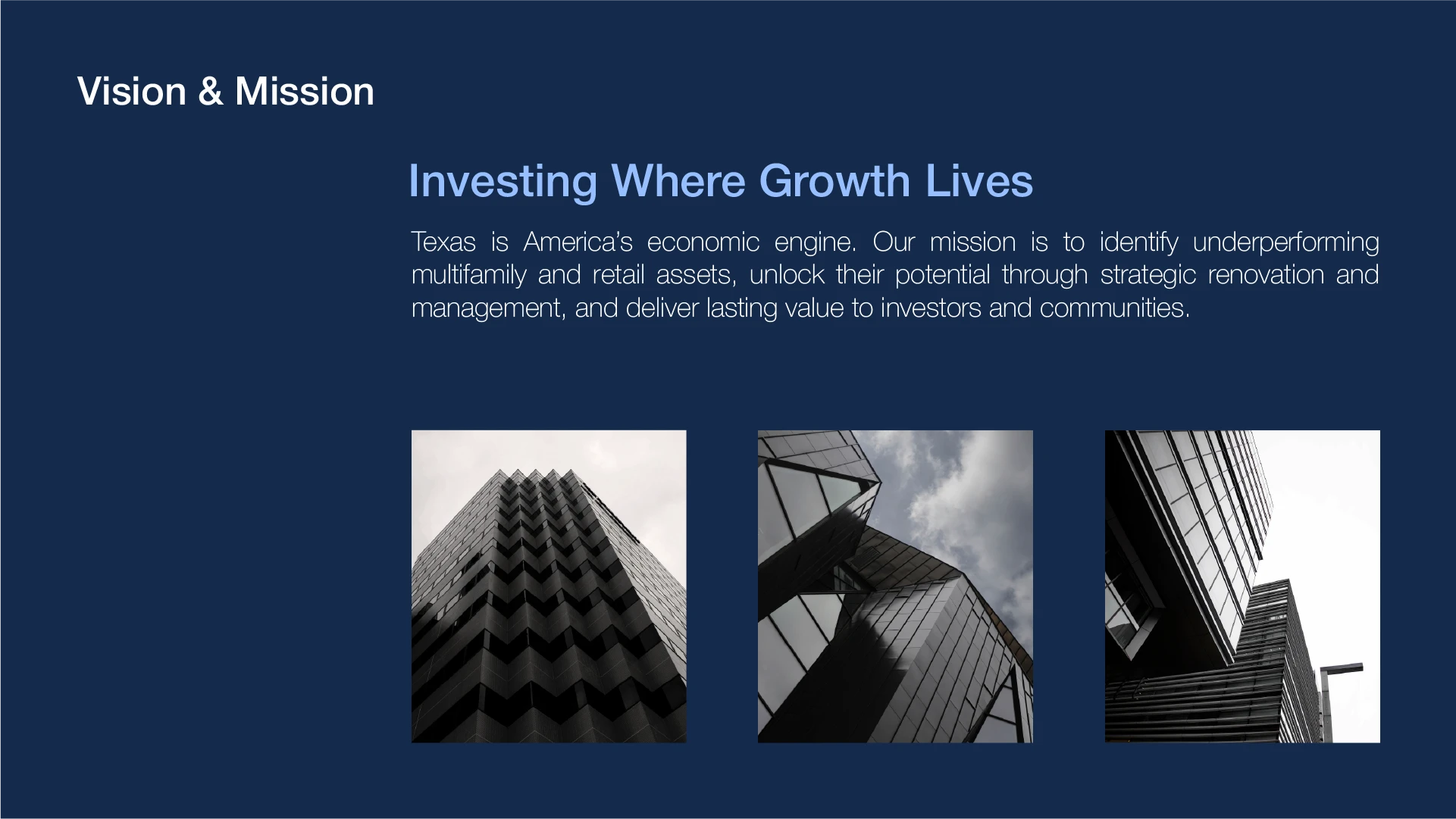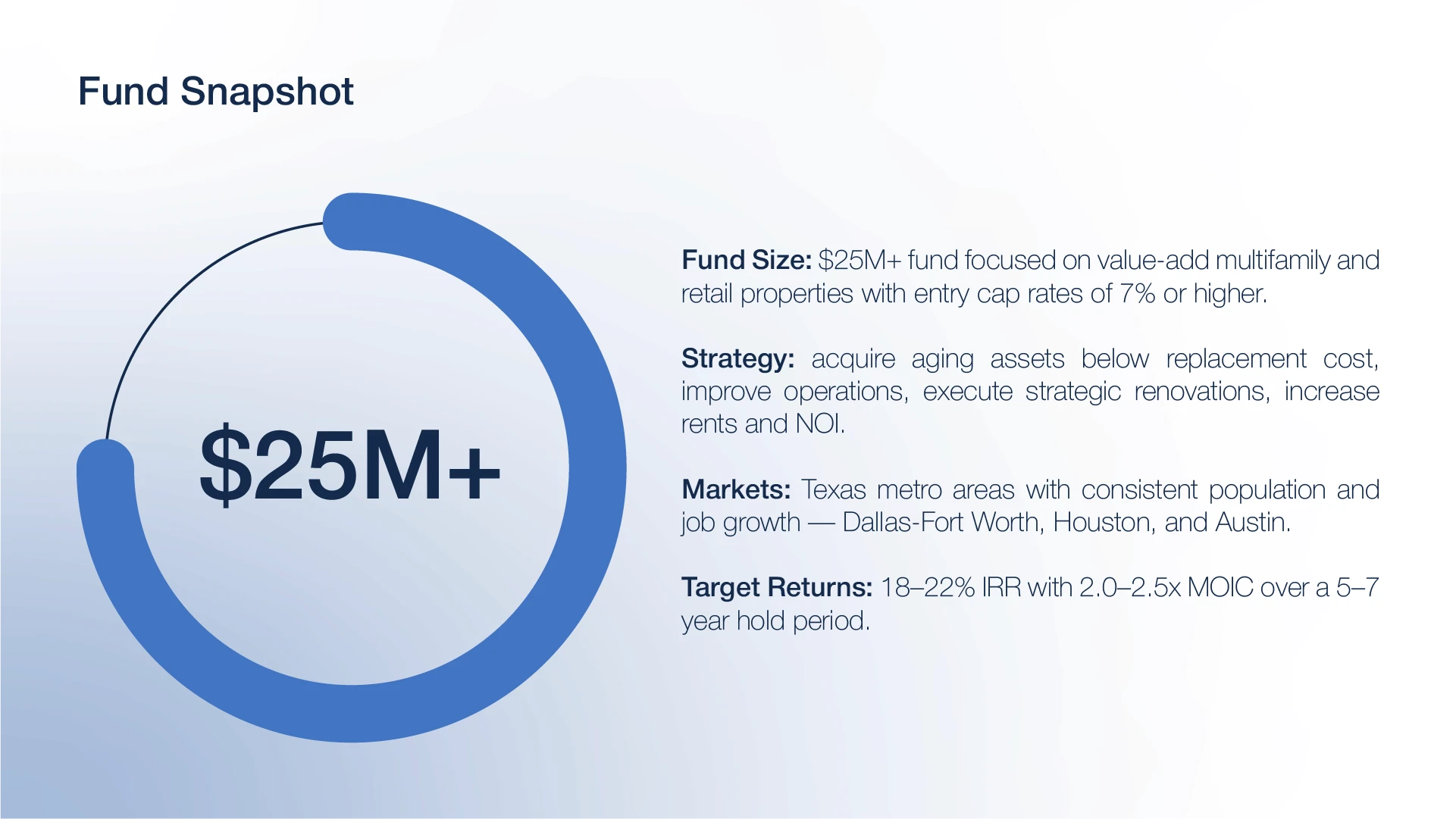 Lone Star came to us with a high stakes challenge. They were preparing to raise capital for a Texas based value add real estate fund, but their narrative was fragmented, the financial story lacked investor ready clarity, and the materials did not reflect the sophistication required to win commitments from serious LPs. They had strong market insight and solid returns, yet the presentation did not communicate confidence, strategy, or institutional level structure.